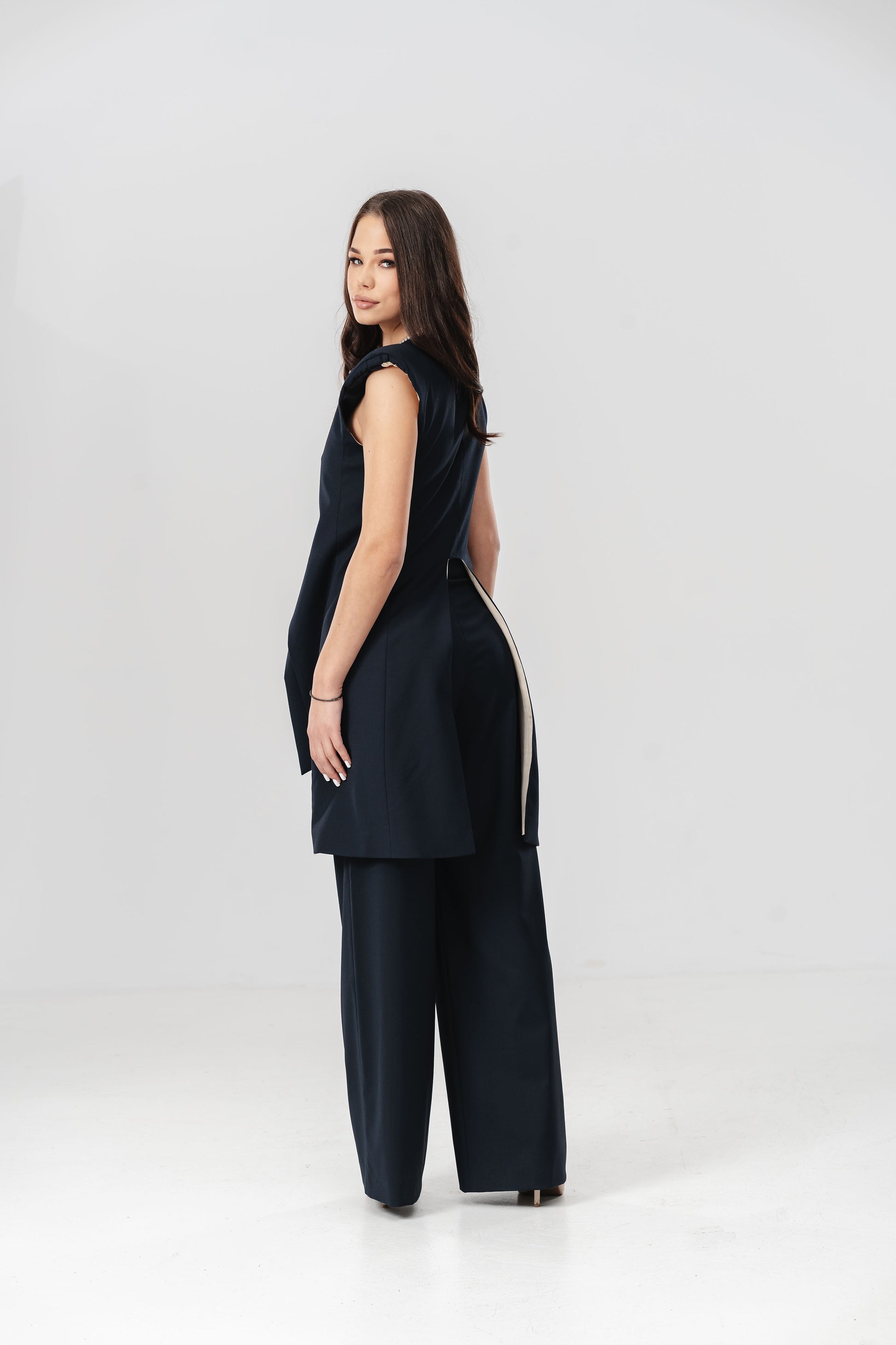 Adaugă un strop de originalitate și rafinament garderobei tale cu vesta Vanguard asimetrică, un element deosebit ce îmbină designul modern cu confortul.