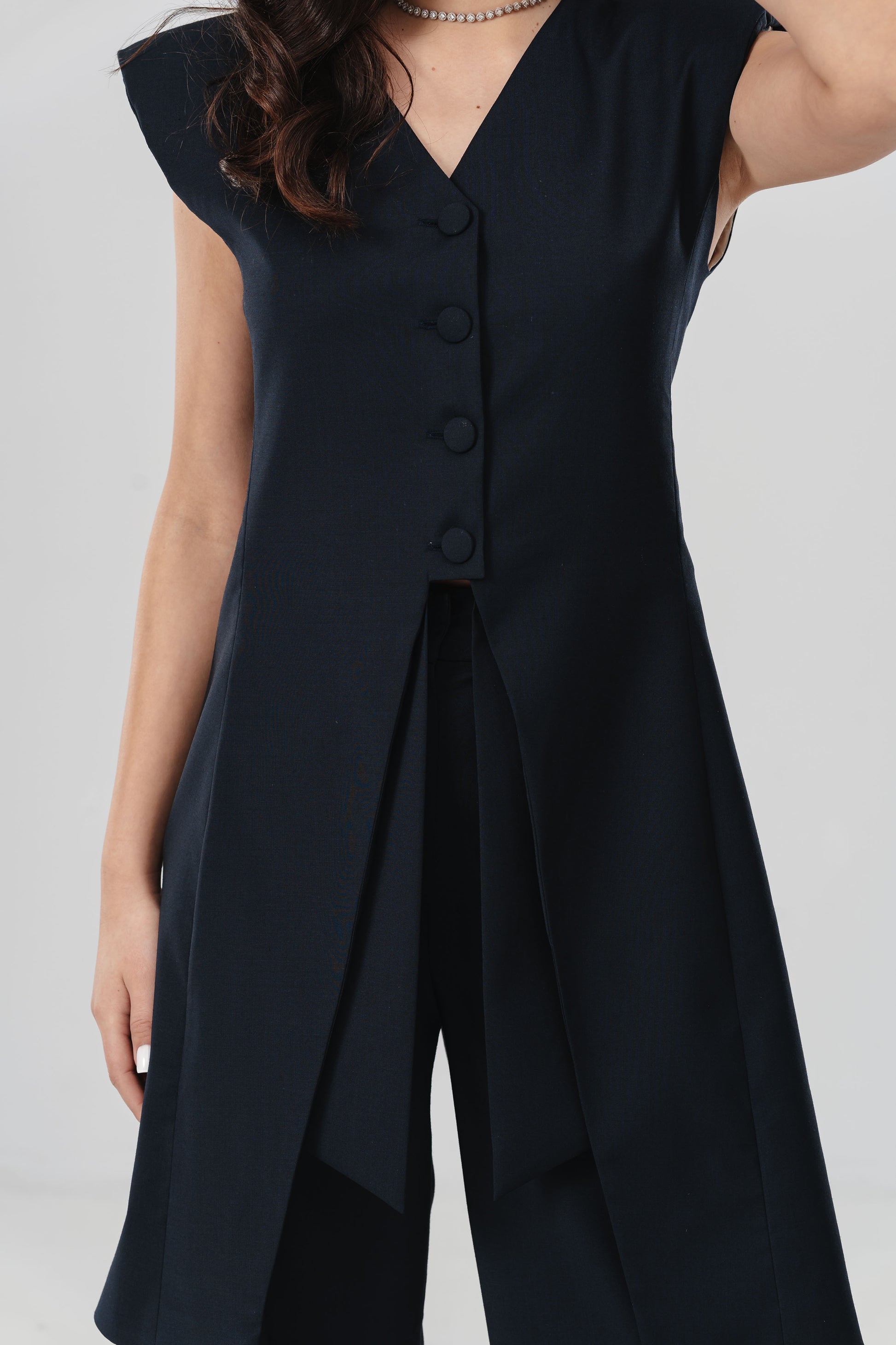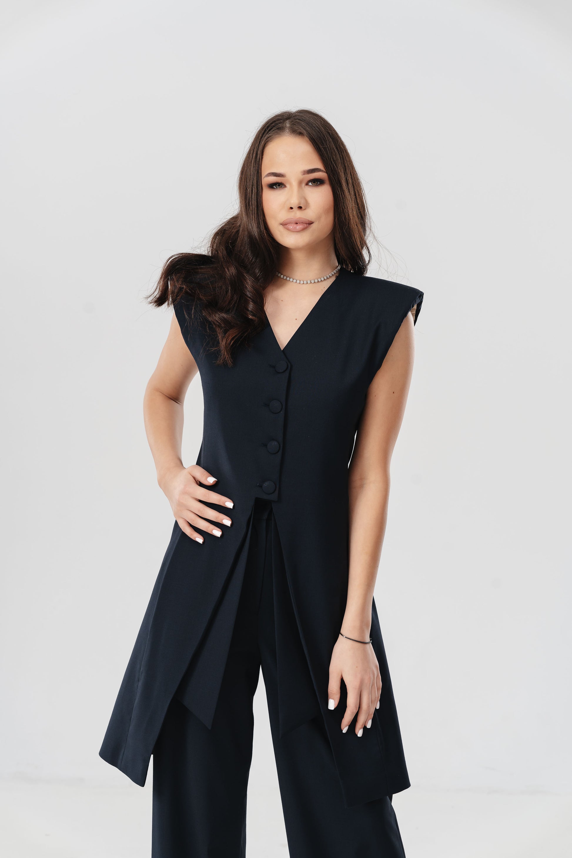 Vesta prezintă o croială asimetrică, cu un decolteu în V și închidere frontală cu nasturi, oferind un look contemporan și sofisticat.