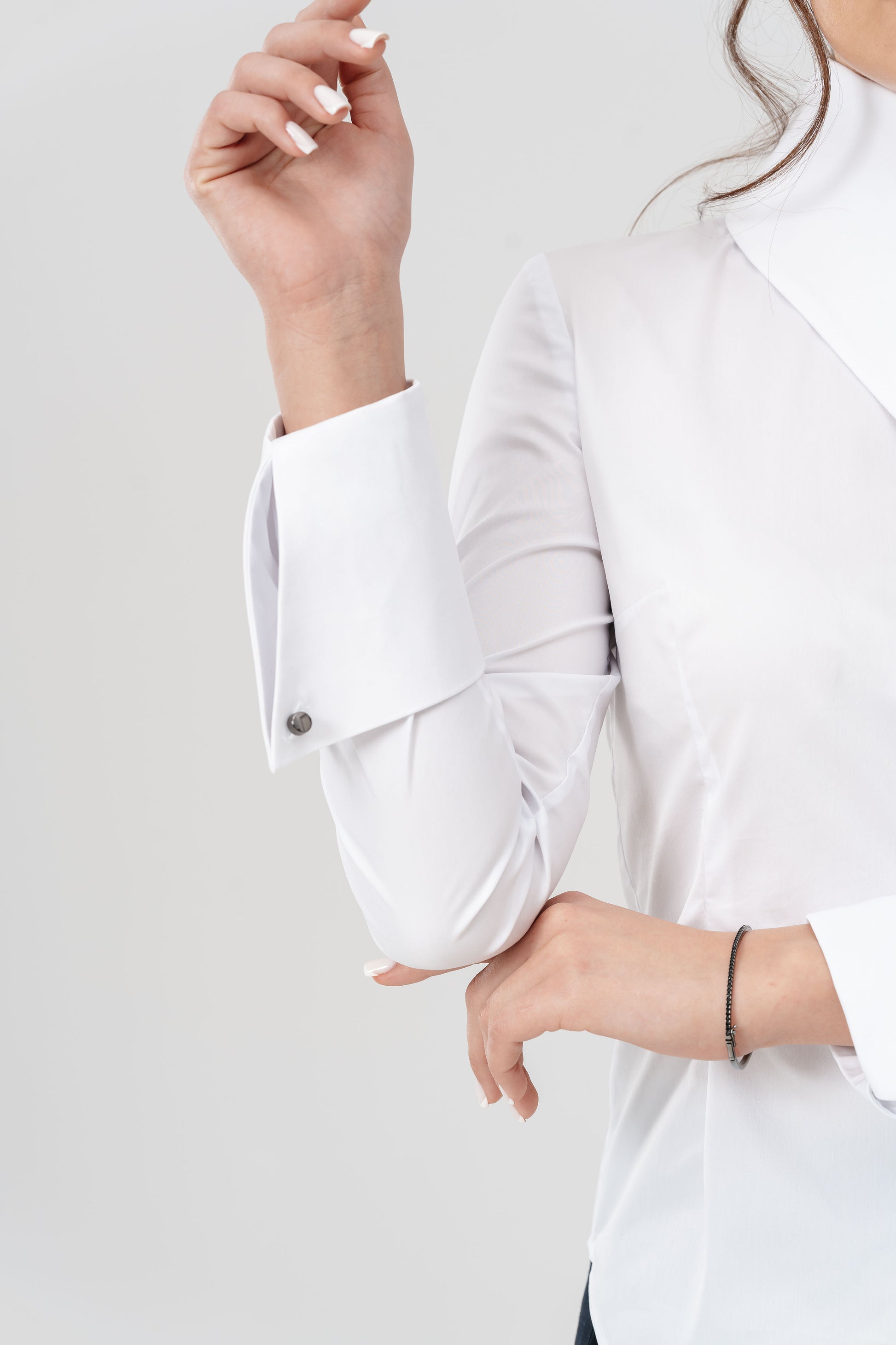 Mâneci lungi cu manșete late, accentuate de nasturi pretiosi, pentru un plus de rafinament.