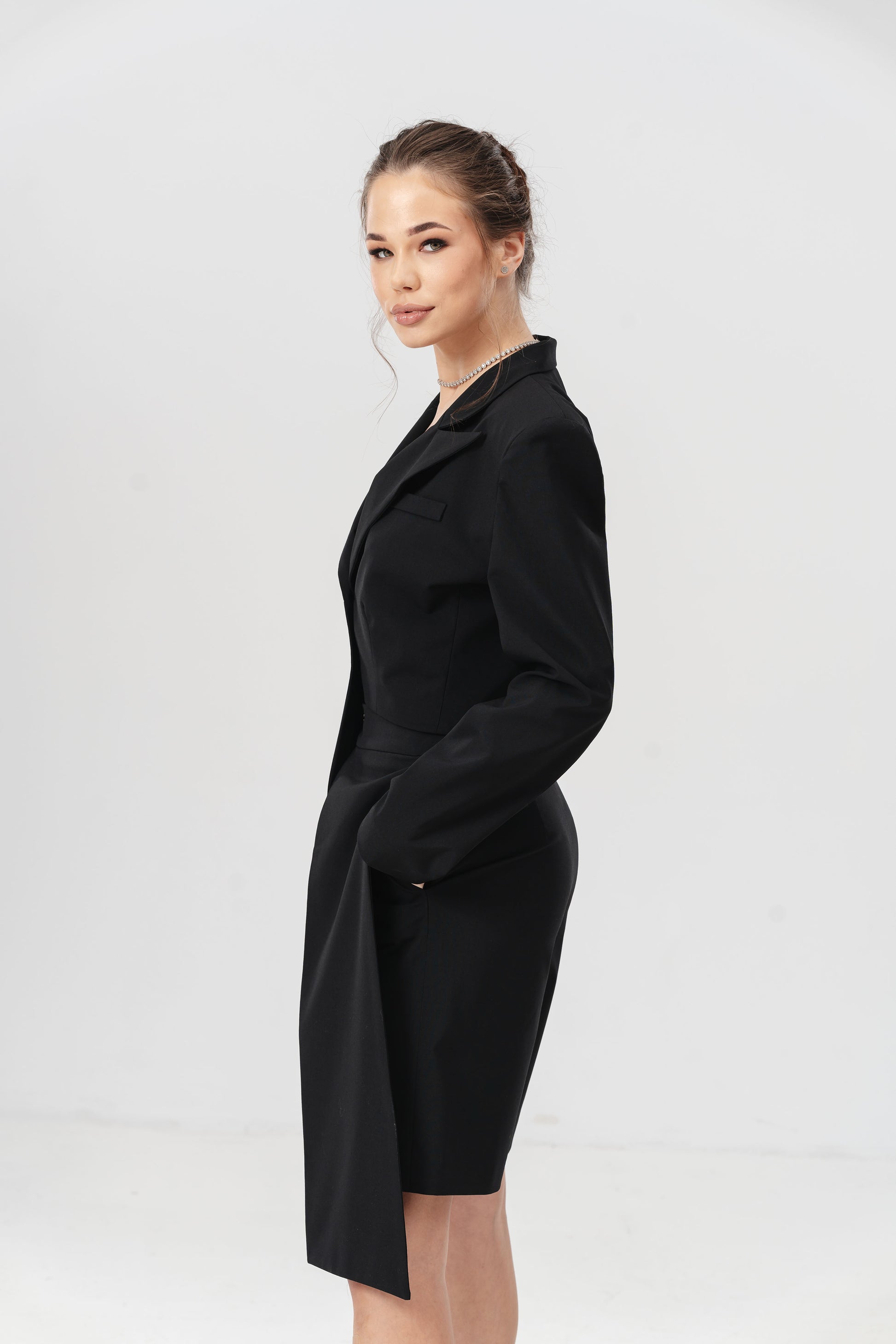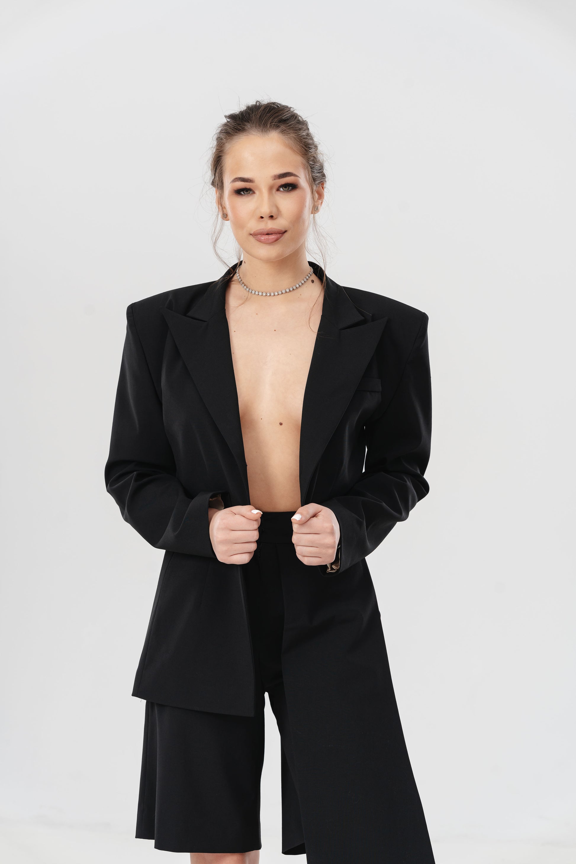 Pantalonii Noir îmbină cu eleganță linii clasice și un design inovator. Croiala asimetrică este accentuată de detaliul suprapus tip fustă, oferind un look nonconformist și sofisticat. Acești pantaloni scurți sunt ideali pentru persoanele care doresc să iasă în evidență printr-un stil unic, fără a sacrifica confortul.