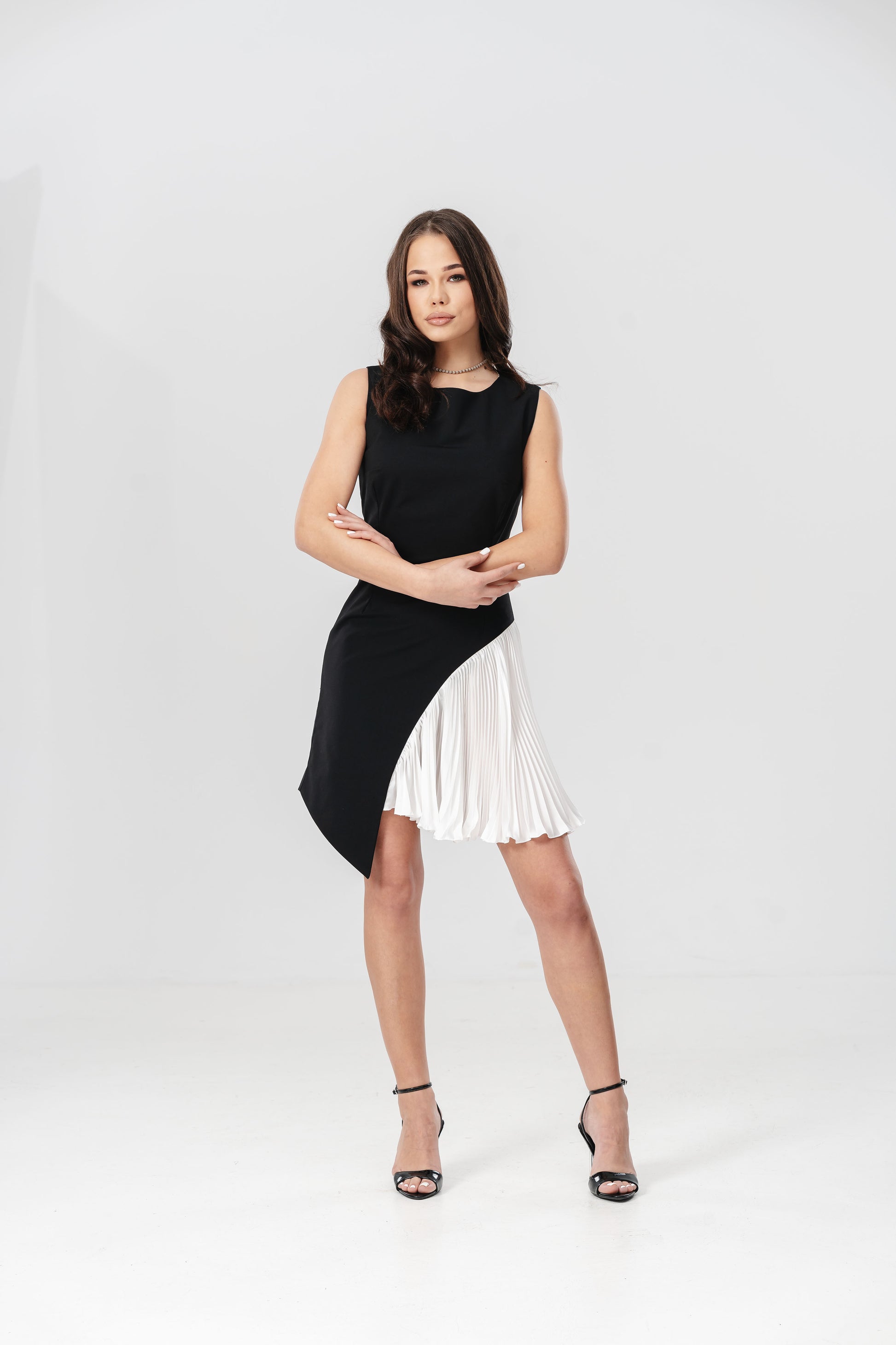 Rochia Amour este o expresie a elegantei moderne, combinând rafinamentul clasic al negrului cu delicatetea materialului plisat alb, usor transparent. Silueta minimalistă si croiala asimetrică adaugă un aer sofisticat, evidentiind feminitatea într-un mod subtil, dar captivant. Detaliul plisat creează un contrast vizual de impact, oferind fluiditate si un joc delicat de texturi la fiecare miscare. Perfectă pentru evenimente speciale sau seri elegante, rochia Amour este alegerea ideală pentru femeile care îmbină simplitatea cu detaliile spectaculoase.